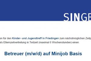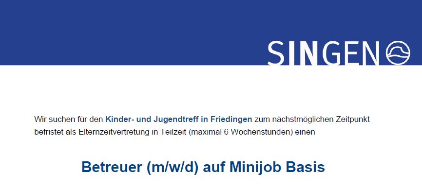 Wir suchen für den Kinder- und Jugendtreff Friedingen zum nächstmöglichen Zeitpunkt befristet als Elternzeitvertretung in Teilzeit (max. 6 Wochenstunden) einen Betreuer*in.
