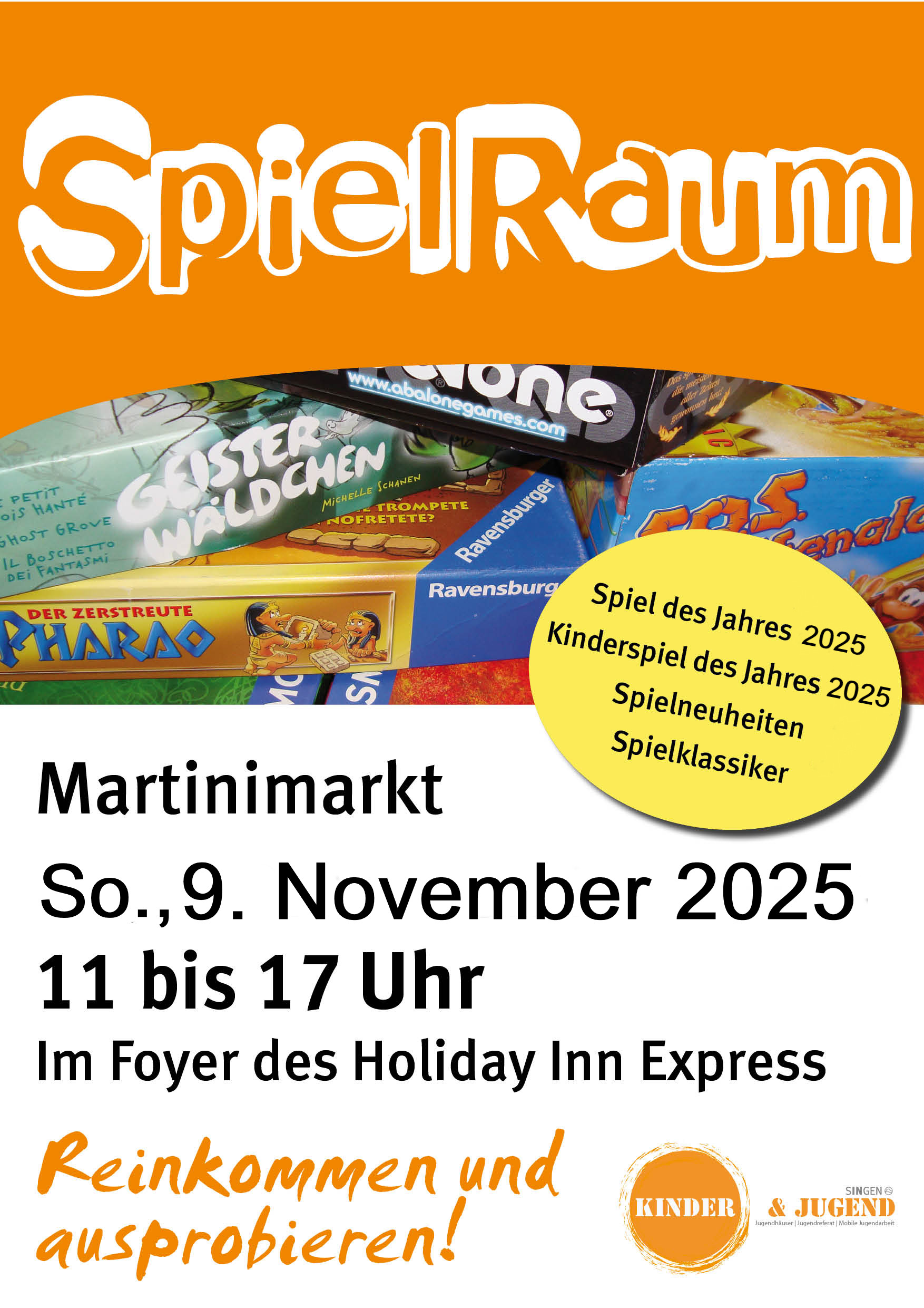 Der „SpielRaum“ (früher "Brettspieltag“) hat auf dem Martinimarkt schon eine lange Tradition. In diesem Jahr ist das städtische Team der Abteilung Kinder und Jugend zum 16. Mal im Foyer des Holiday Inn Express Singen präsent. In diesem Jahr wird auch erstmals die Stadtbücherei der Stadt Singen mit ihren Brettspielen und Mitarbeitern den „SpielRaum“ bereichern.